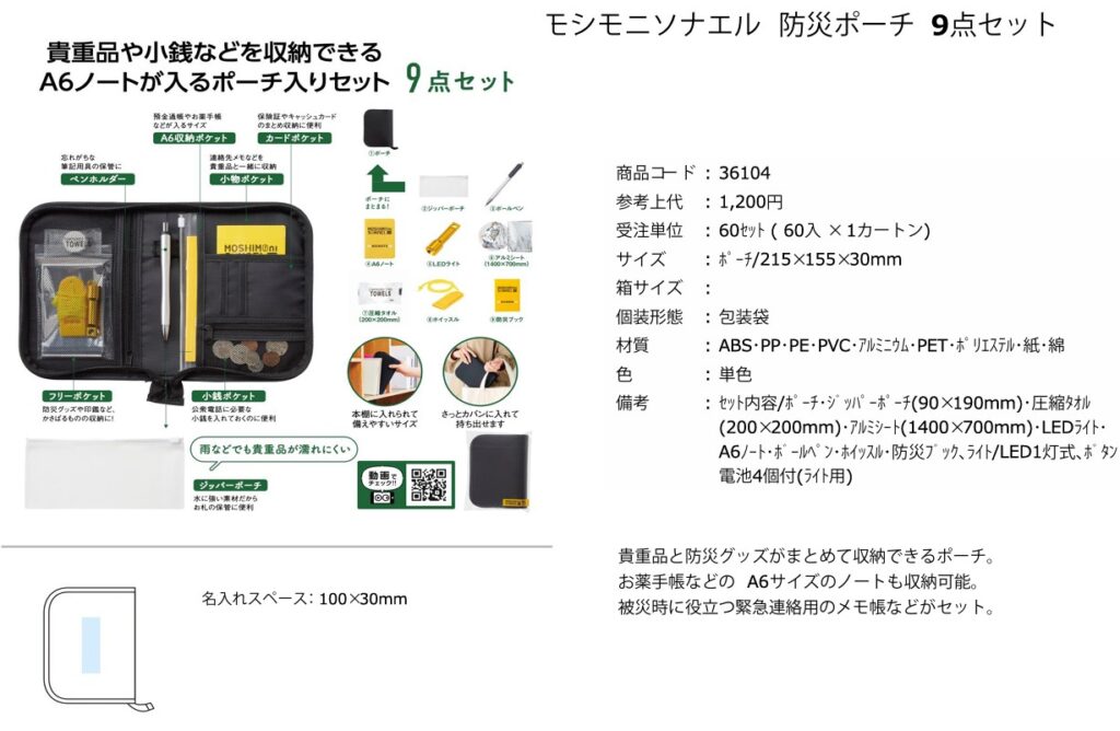 | 商品コンセプト | 貴重品と防災グッズがまとめて収納できるポーチ。 お薬手帳等A6サイズのノートが収納可能です。 被災時に役立つ緊急連絡用のメモ帳などがセット。 |